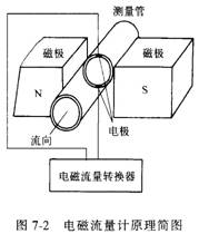 與此相似,如果在磁感應強度為B的均勻磁場(chǎng)中,垂直于磁場(chǎng)方向放一個(gè)內徑為D的不導磁管道,當導電液體在管道中以流速u(mài)運動(dòng)時(shí),導電液體就切割磁力線(xiàn),如果在管道截面上垂直于磁場(chǎng)的直徑兩側安裝一對電極(如圖7-2所示),則可以證明,只要管道內流速分布為與軸對稱(chēng)分布,則兩電極間將產(chǎn)生感生電勢