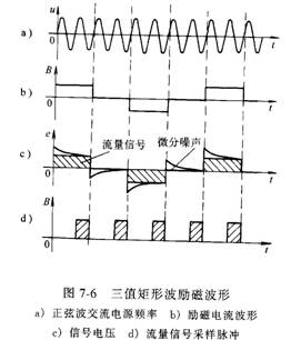 三值低頻矩形波勵磁方式的勵磁電流一般采用工頻的1/8頻率,以+B,0,-B三值進(jìn)行勵磁,通過(guò)對正-零-負-零-正變化規律的三種狀態(tài)進(jìn)行采樣和處理,如圖7-6所示。其首要的特點(diǎn)是能在零態(tài)時(shí)動(dòng)態(tài)校正零點(diǎn),有效地消除了流量信號的零位噪聲,從而大大提高了儀表零位的穩定性;其次,它與低頻矩形波勵磁技術(shù)一樣,可以采用同步采樣技術(shù)來(lái)消除上升沿和下降沿處的微分干擾;采用寬脈沖采樣以消除混在流量信號中的工頻干擾信號;第三,它可以通過(guò)一個(gè)周期內的四次采樣值,近似認為極化電勢恒定,利用微處理機的數值運算功能得以消除極化電勢的影響。