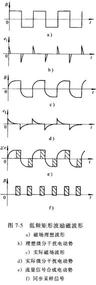 三值低頻矩形波勵磁零點(diǎn)穩定,但無(wú)法抑制低頻噪聲;較高頻率的矩形波磁場(chǎng)能消除低頻噪聲,但一般其零點(diǎn)穩定性欠佳。人們在分析各種勵磁技術(shù)的基礎上,提出了雙頻矩形波勵磁技術(shù),其磁場(chǎng)波形如圖7-3f所示。高頻部分是75Hz的矩形波,外包絡(luò )線(xiàn)是1/8工頻的低頻矩形波。采用這種勵磁方式,可用高頻波采樣來(lái)消除含纖維和固體顆粒流體介質(zhì)的低頻噪聲,同時(shí)又保持了低頻矩形波勵磁零點(diǎn)穩定的優(yōu)點(diǎn),取得了很好的應用效果。
