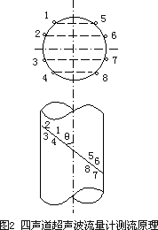 圖2為在充滿(mǎn)液體的圓形管道中采用平行四聲道超聲波流量計的測流原理示意圖。