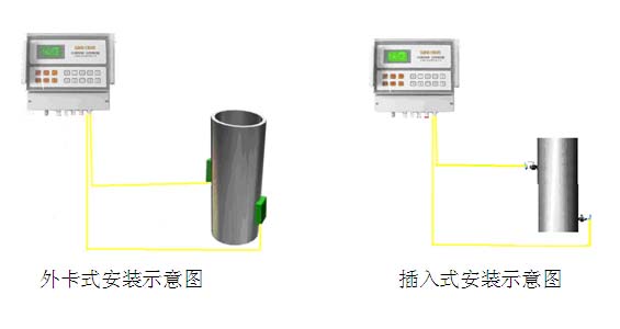 在滿(mǎn)管流的條件下,適合各種流體測量,例如自來(lái)水、污水廠(chǎng)格柵后或可以使用時(shí)差式超聲波流量計,可以采用外卡式或插入式安裝: